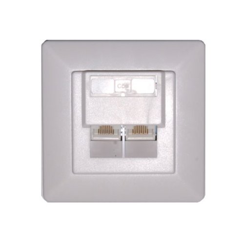 Zásuvka 2x RJ-45, nestíněná, pod omítku. CAT5E, konektory RJ-45 orientovány šikmo v úhlu 45 st., barva bílá, montáž do krabice pod imítku, narážecí kabelové konektory (Duální - 110 i LSA). Instaluje se do běžných elektroinstalačních krabic.