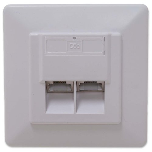 Zásuvka 2x RJ-45, stíněná, pod omítku. CAT6, konektory RJ-45 orientovány šikmo v úhlu 45 st., barva bílá, montáž do krabice pod omítku, narážecí kabelové konektory (Duální - 110 i LSA). Instaluje se do běžných elektroinstalačních krabic. Možnost krabičky pro povrchovou instalaci.
