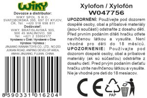 Xylofon. Rozměry 19x11x1,8 cm. Obsah balení - xylofon, 2 paličky.