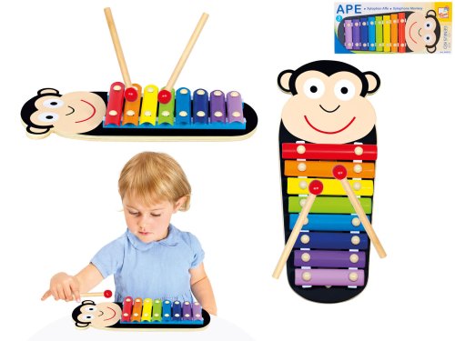 Dětský xylofon s motivem opičky. 3-dílná sada s 8 kovovými zvukovými pláty, které nabízejí hraní v plném rozsahu. Xylofon nabízí dětem příležitost seznámit se se základy hudby a rozvíjet svůj hudební talent. Je tak ideální hračkou pro první dětské hudební kroky.