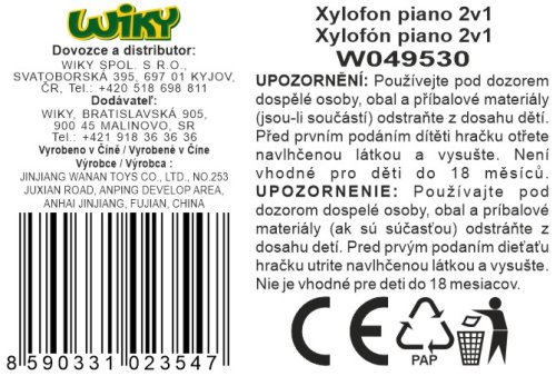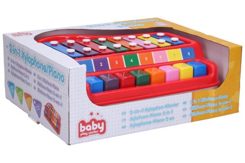 Xylofon piano 2v1. Velikost 24cm. Obsahuje xylofon a dvě paličky. Možnost hrát klasicky paličkami, nebo mačkat klávesy, které rozeznívají xylofon také. Jednotlivé klávesy a destičky jsou barevně rozlišeny. Na obale 4 písničky, které lze hrát podle barevného schématu.