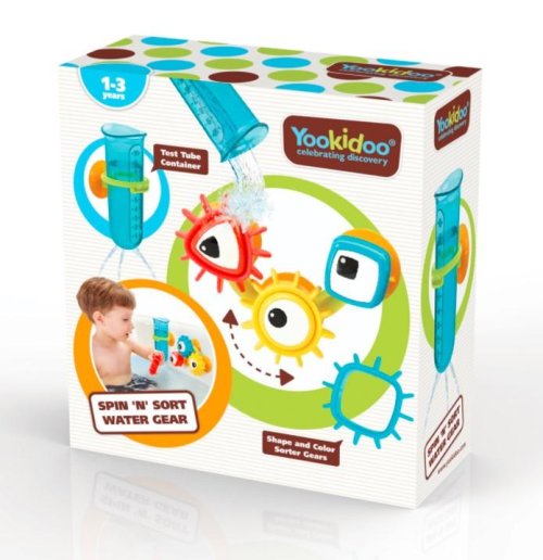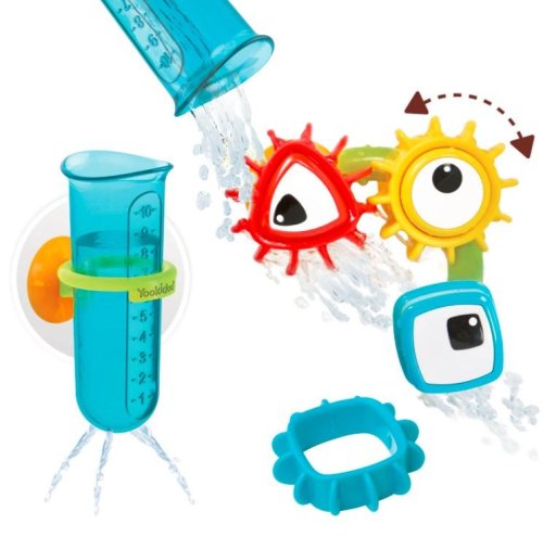 Sestavte převody podle tvarů a barev. Nalitím vody ze zkumavky se roztočí celý mechanismus. Hračka se připevňuje ke stěně vany pomocí přísavek.