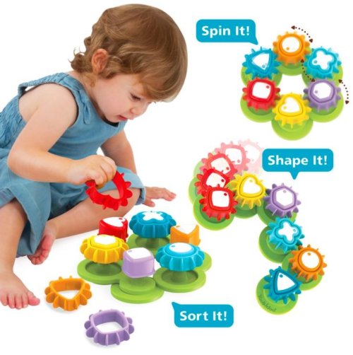 Kolem jednoho roku věku získá vaše dítě větší kontrolu nad svými malými ručičkami a je vhodný čas na rozvoj jemné motoriky. Velké snadno uchopitelné barevné geometrické tvary jsou skvělým pomocníkem, jak se s dítětem začít učit rozpoznávání barev a tvarů. Povzbuďte své dítě, aby objevovalo a prozkoumávalo různé tvary a pohyb rotujícího zařízení. Ukazujte mu barvy a tvary a chvalte ho za správné umístění částí. Uvědomte si, že učení pomocí pokusů a omylů je velmi důležité pro výuku vašeho dítěte. Ukažte mu různé obrazce vytvořené z hračky a sdílejte jeho potěšení ze skutečnosti, že bez ohledu na rozvržení se ozubená kola budou vždy točit, pokud správně přiřadí barvy a tvary.