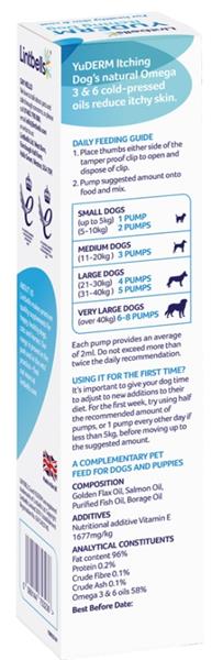 YuMOVE Skin & Coat Care Itching je přírodní doplňkové krmivo ve formě oleje pro psy, které pomáhá zklidnit citlivou kůži, omezit svědění a škrábání a celkově zlepšuje stav kůže a srsti už po 3–6 týdnech pravidelného používání. Lněný olej je bohatým zdrojem omega-3 mastných kyselin, které mají pozitivní vliv na kvalitu srsti a tím snižují línání. Lososový olej je za studena lisovaný, vysoce kvalitní a extra čerstvý. Jeho zpracování trvá méně než 4 hodiny od chvíle dopravení z lodi po naplnění do lahve. Brutnákový olej je bohatým zdrojem omega-6 mastných kyselin, které podporují tvorbu a regeneraci pokožky, napomáhají udržení kožní bariéry a snižují nadměrné línání způsobené suchostí kůže. Vitamín E podporuje přirozenou obranyschopnost pokožky. Hlavní přednosti: