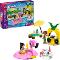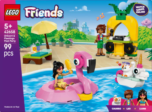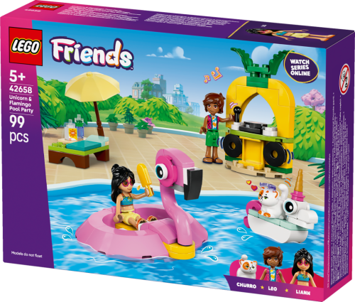Stavebnice LEGO® Friends (42658) Zábava u bazénu s jednorožcem a plameňákem přináší spoustu herních možností a děti se s ní ponoří do vyprávění příběhů. Tato stavebnice pro holky a kluky od 5 let obsahuje 2 sestavitelné nafukovací hračky, doplňky k bazénu, 2 minipanenky LEGO Friends a figurku kočky. Děti můžou vymýšlet kreativní příběhy s Leem, Liann a Churrem a užít si zábavnou párty u bazénu s nafukovacím jednorožcem a plameňákem. V sestavitelné nafukovačce v podobě plameňáka je místo pro 2 postavy a součástí je držák na 2 nanuky. Menší nafukovačka s motivem jednorožce je jako stvořená pro kocoura Churra, který se rád přidá. Součástí stavebnice je také křeslo, djský pult s točící se deskou a mikrofonem, opalovací krém a nápoj pro ještěnápaditější hraní. Objevte další skvělé stavebnice ze světa LEGO Friends (prodávají se samostatně) podporující rozvoj sociálních a emočních dovedností. Tato stavebnice je kompatibilní s aplikací LEGO Builder, která přináší intuitivní stavitelské dobrod ružství. V ní děti můžou přibližovat a otáčet modely ve 3D, ukládat své stavebnice a sledovat svůj postup při stavění.