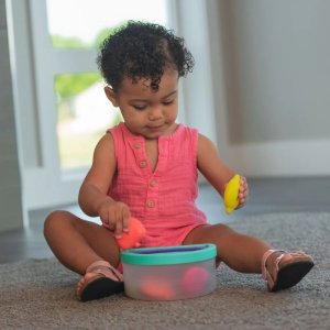 6+ měsíců: Sejměte víko z misky. Miminka milují vkládání a vysypávání a opakování, stále dokola, což pomáhá dítěti budovat důležitá mozková spojení.