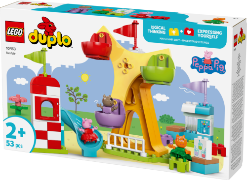Se stavebnicí LEGO® DUPLO Prasátko Peppa Zábavní park se malé děti budou učit hrou a užijí si zábavné okamžiky na karnevalu s postavami ze svého oblíbeného seriálu Tato stavebnice pro nejmenší obsahuje 3 figurky LEGO® DUPLO: Prasátko Peppu, psa Danyho a kočku Máňu, a navíc otáčející se ruské kolo, skluzavku a džusový bar Batolata pošlou postavičky dolů po skluzavce, umístí je do kabin ruského kola a pak je vezmou do džusového baru Tato stavebnice v zábavného parku podněcuje rozvoj logického myšlení, procvičování třídění barev a jemné motorické dovednosti Pomáhá batolatům porozumět emocím během prvních zážitků