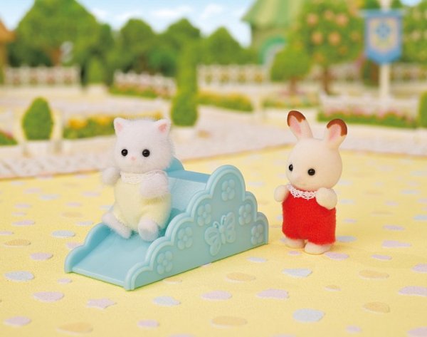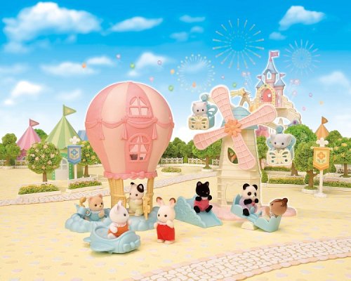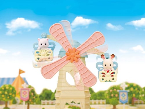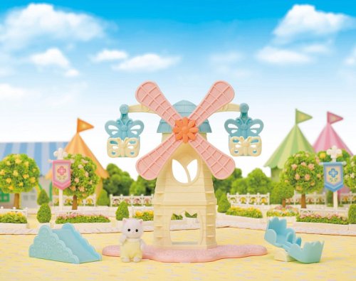 Sada Zábavný park s větrným mlýnem a kotětem obsahuje větrný mlýn, figurku a nábytek. V sadě ještě najdete tulipánovou houpačku, květinovou skluzavku a miminko perské kočky. Díky otáčení větrným mlýnem se motýlí gondola pohybuje nahoru a dolů. Figurky miminek lze umístit na gondolu a houpačku. Tato sada obsahuje figurku a nábytek a lze si s ní hrát samostatně. Tento zábavní park si můžete užít také s jinými figurkami miminek nebo dvojčat (vše se prodává samostatně). Stimuluje u dětí imaginativní hraní rolí. Věk: 3+