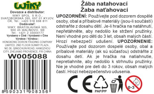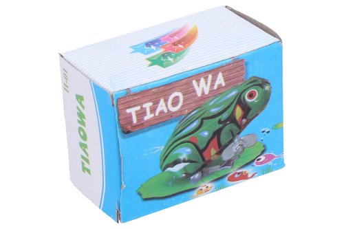 Pohyb plechové žabky zajišťuje pérový strojek natahovaný klíčkem. Rozměry balení 7 x 5 x 4 cm. Vhodné pro děti od 3 let.