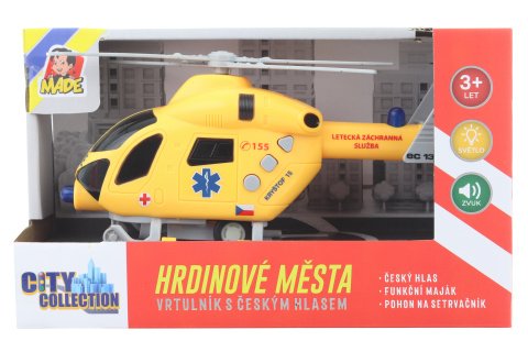 Vrtulník ambulance v českém designu s českým hlasem. Simuluje rozhovor dispečinku a pilota: Dispečink: Hromadná nehoda na čtyřicátém kilometru dálnice. Na místě jsou ranění. Ihned se připravte k odletu. Pilot: Cíl na dohled. Zahajuji sestup. Připravte se k zásahu. Vrtulník je na setrvačník a obsahuje světelné a zvukové doplňky. Funkční maják. Rozměry boxu 23 x 13,5 x 10 cm. Český box Vrtulník je napájen bateriemi 3x AG13 (jsou součástí balení). Vhodné pro děti od 3 let