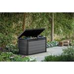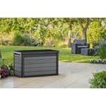 Zahradní box je vybavený hydraulickými písty pro plynulé otevírání. Po jeho uzavření ho využijete jako místo k sezení pro 2 osoby. Box je navíc vyrobený z technologicky vyspělého materiálu Evotech. Díky tomu má nejlepší vlastnosti plastů, takže odolá UV záření i extrémním srážkám. Navíc nedochází k hnilobě, rezivění nebo loupání barvy.