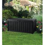Zahradní box je vyrobený z vysoce kvalitní polypropylenové pryskyřice v moderním designu v grafitové barvě, který imituje dřevo a jeho strukturu. Skříň je nízká a její propracovaná konstrukce zvládne unést až 240 kg, takže ji mohou využít k sezení až 2 dospělé osoby. Stěny jsou vyztužené žebrovými segmenty, takže skříň hravě odolá i drsnému zacházení a vandalismu a nevadí ji ani extrémní počasí či UV záření.