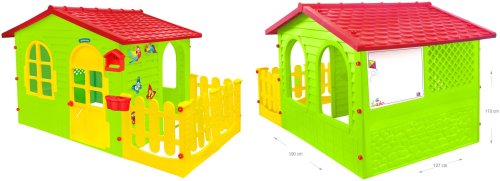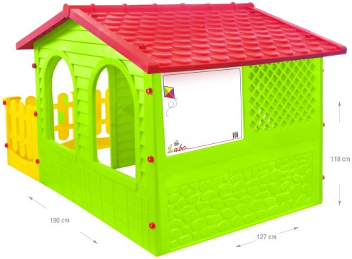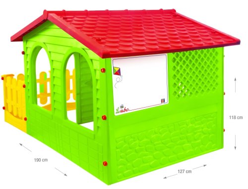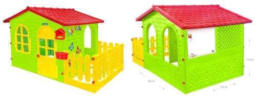 Plastový domeček pro děti je vhodný na zahradu i do dětského pokojíčku. Domek má červenou střechu, zelené stěny a žlutý plot, dveře a okenici. Vše je vyrobeno z kvalitního plastového materiálu odolného vůči UV záření a povětrnostním vlivům. Ze zadní strany domečku je bílá tabule na popisování a kreslení. Součástí domečku je i krmítko a schránka Součástí balení jsou i barevné samolepky papoušků, motýlů a květin. Rozměry sestaveného domečku: 190 x 127 x 118 cm. Šířka domečku bez plotu je cca 130 cm. Vhodné pro děti od 1 roku.