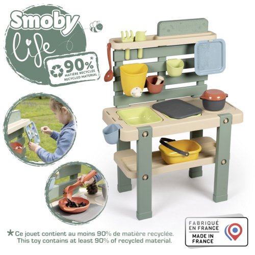 Venkovní kuchyňka vybavená různým příslušenstvím, celkem 15 ks doplňků. Plastové díly jsou ošetřeny anti-UV, což zajišťuje dobrou odolnost a stálost barev v průběhu času. Tento výrobek obsahuje minimálně 90% recyklovaného materiálu. Rozměry výrobku (DxŠxV): 72 x 36 x 99 cm.