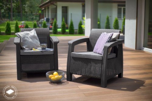 2 kusy zahradních křesel Corfu v grafitové barvě z nejoblíbenější řady nábytku od Keteru vás nadchnou svým nevšedním designem v imitaci přírodního ratanu. Konstrukce je přitom pevná a vydrží běžné zatížení venkovního provozu.
