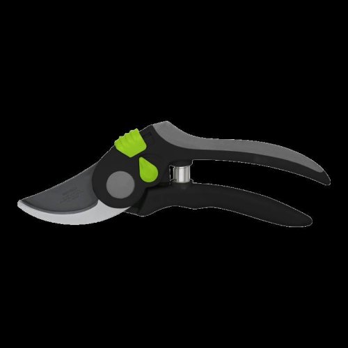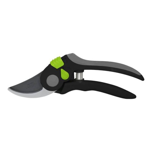 čepel z japonské oceli SK5 s vysokým obsahem uhlíku a teflonovým povlakem čepel (průchozí) na stříhání mladých výhonků a větví pohodlné nylonové rukojeti regulace otevírání rukojetí bezpečnostní zámek