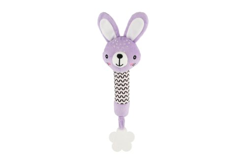 Roztomilý fialový zajíček je ideální první hračka pro miminka již od narození. Díky dlouhému měkkému tělíčku se dobře drží v malých ručičkách a po stisku vydává jemný pískací zvuk, který podporuje sluchový rozvoj dítěte a přirozeně upoutává jeho pozornost. Na spodní části je umístěno měkké plastové kousátko ve tvaru kytičky, které uleví citlivým dásním při růstu prvních zoubků. Kontrastní černobílé vzory na tělíčku zároveň podporují rozvoj vizuálního vnímání. Zajíček je vyroben z hebkého a bezpečného plyše, vhodného i pro nejmenší děti. Produkt je certifikován v ČR, takže splňuje přísné bezpečnostní standardy.
