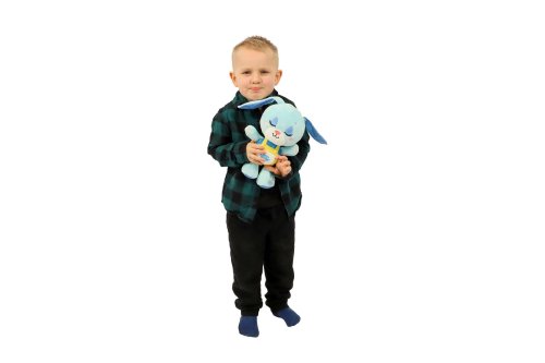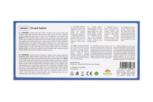 Zajiček je vyroben z hebkého plyše a má plastový panel se světelnými a zvukovými efekty. Po stisknutí tlačítka zahraje jemnou melodii, která uklidní dítě a podbarví příjemnou atmosféru tlumeným světýlkem. Díky napájení na baterie lze hračku snadno používat kdekoliv – v postýlce, kočárku i na cestách. Rozměry balení 22 x 30 x 11 cm Vhodné pro děti od 6 měsíců