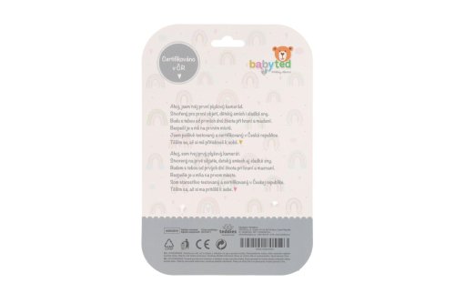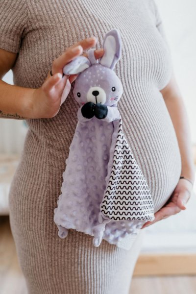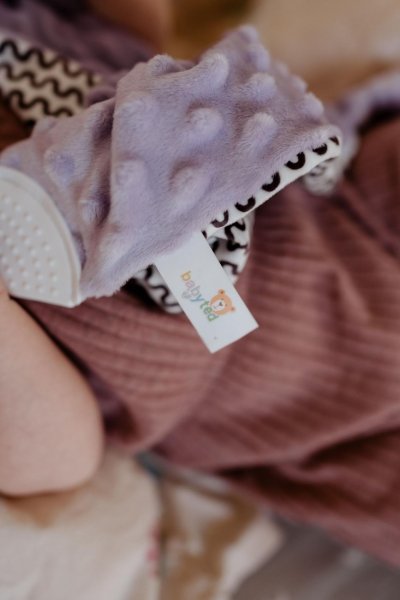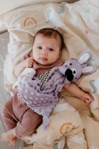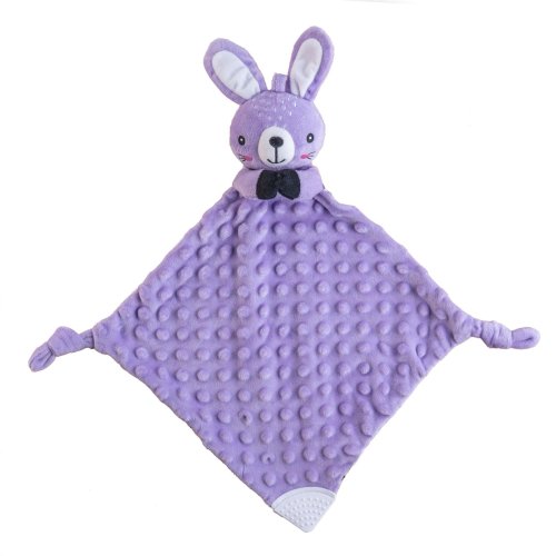 Jemný plyšový usínáček ve tvaru roztomilého zajíčka je ideálním mazlíčkem pro miminka již od narození. Měkký materiál minky s 3D puntíky příjemně stimuluje dotek, uklidňuje a pomáhá miminku cítit se bezpečně při usínání i během dne. Uvnitř je ukryté jemné chrastítko, které podporuje sluchové vnímání. V jednom z rohů je měkké silikonové kousátko, které uleví při prořezávání prvních zoubků. Uzlíky na rozích navíc povzbuzují hmatový rozvoj a snadno se drží i malými ručičkami. Certifikováno v ČR, což zaručuje jeho bezpečnost a vhodnost i pro ta nejmenší miminka.