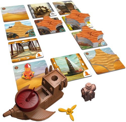 Obsah balení: 49 karet 48 žetonů písku 24 polí 6 figurek 6 šipek 4 části létajícího stroje 1 model létajícího stroje 1 ukazatel písečné bouře 1 stojánek česká a slovenská pravidla