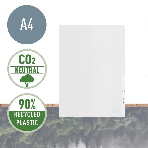 Vyrobeno z 90% recyklovaného plastu (certifikováno nezávislou ext. organizací UL), 100% recyklovatelné a CO2 neutrální L desky A4 pro přenášení, ochranu a prezentaci dokumentů.