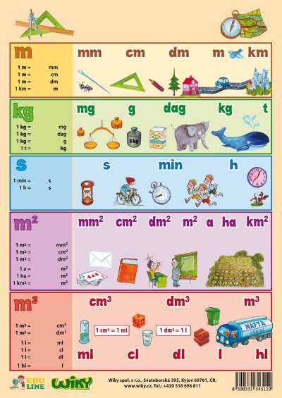 Obsah přední strany tvoří jednotky délky, hmotnosti, času, obsahu a objemu, s převody jednotek a s názornými ilustracemi.