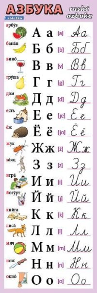 Praktická záložka obsahuje tiskací a psací písmena ruské abecedy včetně výslovnosti a názorného obrázku.