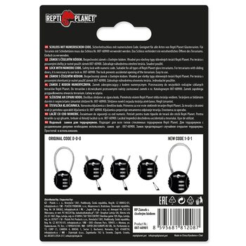 Bezpečnostní zámek s číselným kódem. Vhodné pro všechny typy skleněných terárií Repti Planet. Pro terária s posuvnými dvířky je nutné použít zámek 007-60900. Zabraňuje náhodnému otevření terária. Snadné použití.
