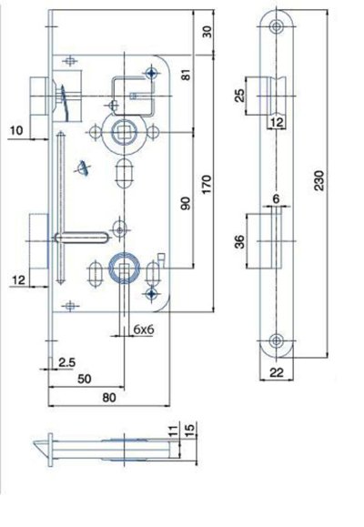 Mezipokojový zadlabací WC zámek Hobes 540 P-L (6x6) pro zamykání kličkou je jednozápadový, bez převodu (střelka ovládaná pouze klikou) a s otvory pro dělené štítky. Rozteč zámku činí 90 mm (vzdálenost mezi osou otvoru pro klíč k ose otvoru pro kliku).