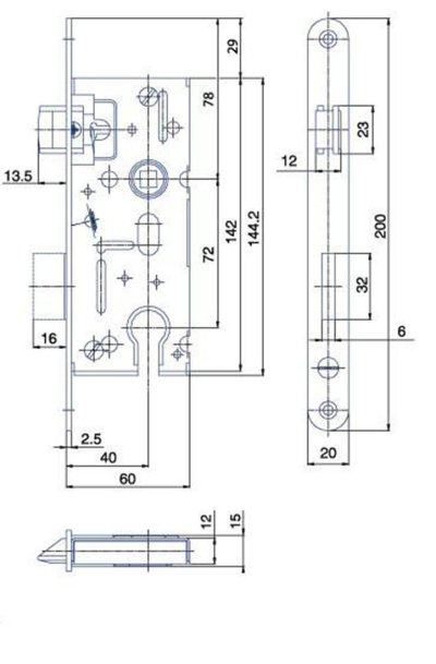 Zadlabací vložkový zámek K105 jednozápadový s převodem a s otvory pro dělené štíty je univerzální na pravé i levé dveře.
