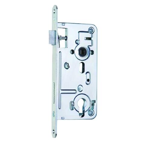 Zadlabací zámek (pravý) určený pro cylindrickou vložku je jednozápadový, s převodem (střelka ovládaná klikou i klíčem) a s otvory pro dělené štítky.