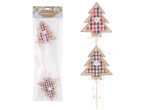 Dekorační dřevěný zápich s motivem stromku o rozměru 75×80 mm, upevněný na špejli pro snadné zapíchnutí. Balení obsahuje 2 kusy, barevné provedení je dodáváno v mixu přírodní, červené a hnědé barvy s jemným glitrem.