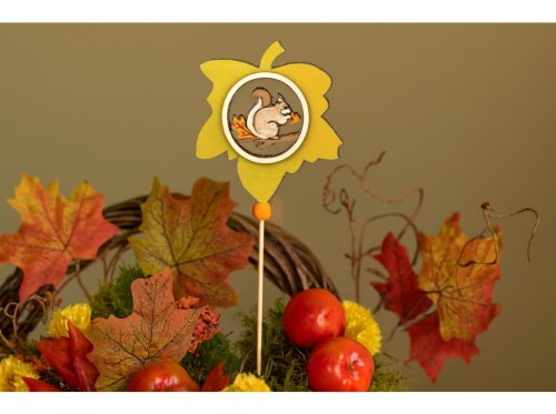Zápich dřevo 85x90mm+špejle list s veverkou, barevná