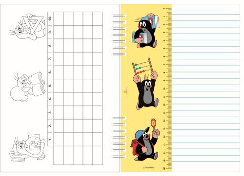 120 stran (z toho 60 stran s linkami), obálka pevná, lesklá s povrchovou úpravou proti oděru, na rubové straně umístěn rozvrh a nedatový kalendář na školní období, pevnou součástí výrobku je i záložka s měřítkem, vazba kroužková