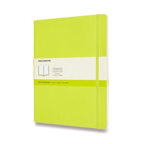 Žlutozelený čistý XL zápisník v měkké vazbě. Obepíná ho pružná páska proti samovolnému otevírání. Každý zápisník je vybaven pořadačem poznámek, který je vyroben z tkaniny a kartonu, textilní záložkou a letákem s historií Moleskine. Papír s gramáží 70 g/m2 neobsahuje kyseliny.