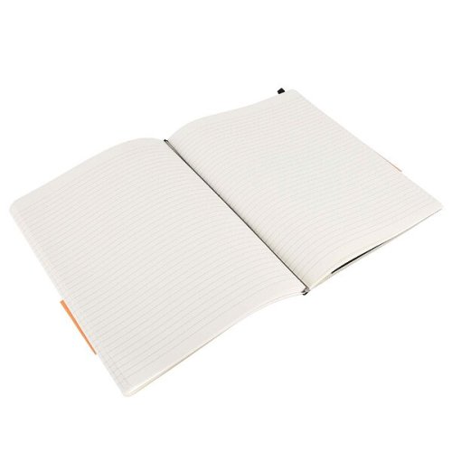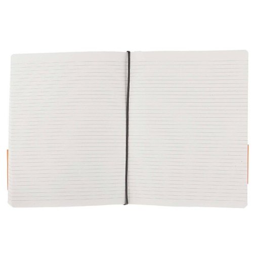 Zápisník s měkkou, ve hřbetu šitou vazbou v kartonových deskách, obepnutý pružnou páskou proti samovolnému otevírání.