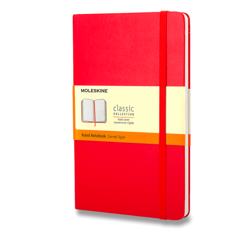 Červený linkovaný zápisník kapesní velikosti. Zápisník má pevnou, ve hřbetu šitou vazbu v kartonových deskách. Obepíná ho pružná páska proti samovolnému otevírání. Každý zápisník je dále vybaven pořadačem poznámek, který je vyroben z tkaniny a kartonu, textilní záložkou a letákem s historií Moleskine. Papír neobsahuje kyseliny.