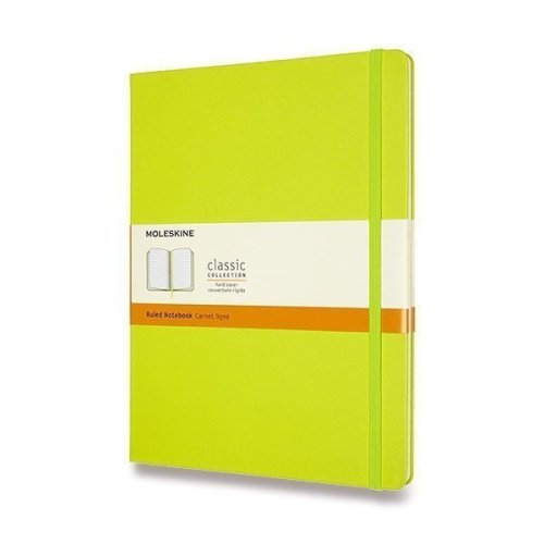 Linkovaný XL zápisník v tvrdé vazbě. Obepíná ho pružná páska proti samovolnému otevírání. Každý zápisník je vybaven pořadačem poznámek, který je vyroben z tkaniny a kartonu, textilní záložkou a letákem s historií Moleskine. Papír s gramáží 70 g/m2 neobsahuje kyseliny.