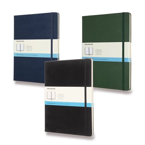 The Moleskine Classic Dotted Extra Large Notebook is a stylish travel companion, perfect for writings, thoughts and passing notes. This black notebook has a cardboard bound cover with rounded corners, acid free paper, a bookmark, an elastic closure and an expandable inner pocket that contains the Moleskine history. Specifications: - Layout: Dotted Paper - Dimensions: 7-1/2" x 10" - Soft Cover with elastic closure and bookmark ribbon. - Color: Black - Pages: 192 - Paper Weight: 70 gsm/47 lb.; FSC Certified Paper; Acid-Free (pH Neutral) - Internal Accordion Pocket