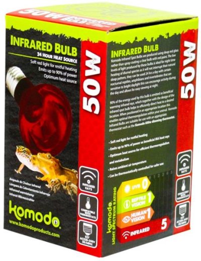 Terarijní žárovka Komodo Infrared Spot Bulb z červeného skla vydává tlumené červené světlo, které umožňuje noční pozorování živočichů bez narušení jejich přirozeného spánkového cyklu. Až 90 % spotřebované energie přitom vychází z žárovky v podobě tepelného záření, které lze díky konstrukci baňky směrovat na konkrétní vyhřívací místo. Žárovka je vhodná nejen pro noční vyhřívání terárií s denními živočichy, ale může sloužit i jako čtyřidvacetihodinový zdroj tepla. U některých světloplachých nočních plazů, obojživelníků a bezobratlých může také podpořit aktivitu během dne. Výhody: