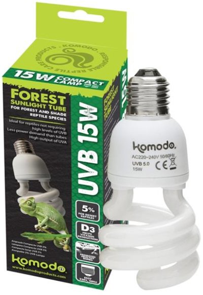 Úsporná terarijní žárovka Komodo Compact Lamp UVB 5% je ideální pro menší terária (o délce max. 60 cm) a pro chov plazů, kteří vyžadují menší množství UVB záření (např. pralesních druhů). Výhody: