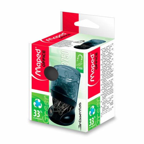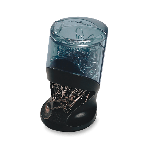 Zásobník na kancelářské sponky s magnetickým držákem. Neklouzající podstavec, průhledná nádobka. Součástí balení je 100 ks poniklovaných sponek,,