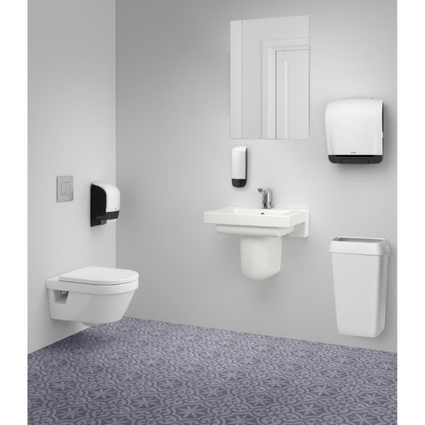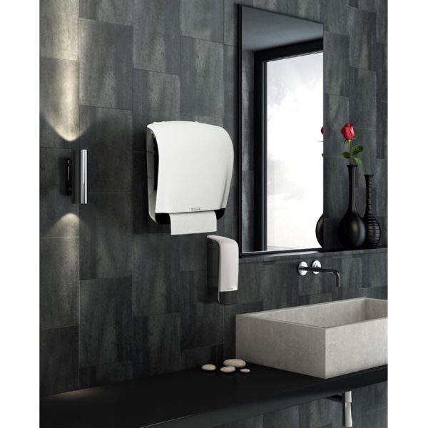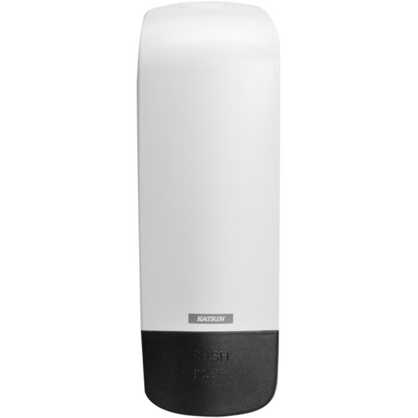 Inovovaný bílý plastový dávkovač na pěnové/tekuté mýdlo Velké tlačítko na předním krytu umožňuje snadnou obsluhu dávkovače bez námahy Dávkovač je pro cartridgové tekuté nebo pěnové mýdlo Katrin 1 l (např.348.401) …
