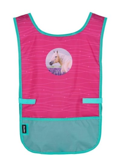 Zástěra pončo do výtvarné výchovy či na jiné tvořící aktivity. Oblékání přes hlavu a po stranách zapínání na suchý zip. Vpředu jedna prostorná kapsa. Materiál 100% polyester.