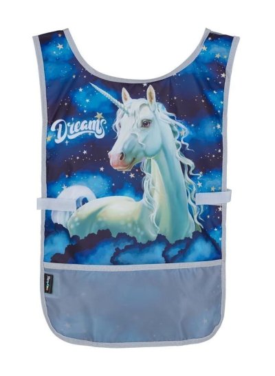 Zástěra pončo do výtvarné výchovy či na jiné tvořící aktivity. Oblékání přes hlavu a po stranách zapínání na suchý zip. Vpředu jedna prostorná kapsa. Materiál 100% polyester.