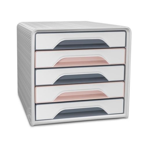 Zásuvkový box Mineral Smoove je vytvarován z jednoho kusu, má velmi robustní korpus s texturovaným povrchem a pět zásuvek s potiskem bukového vzoru, který působí jemně a dekorativně