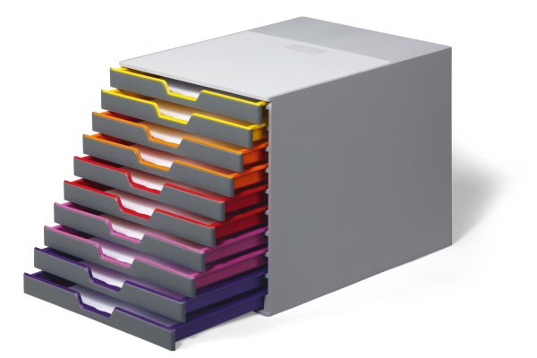 Atraktivní, inovativní box se barevnými, hladce výsuvnými zásuvkami a štítky pro jejich označení