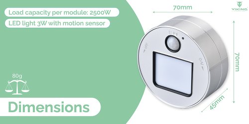 Zásuvkový modul • kompaktní rozměry 7 x 7 x 4,5 cm • LED světlo 3W s pohybovým senzorem • přípojkový konektor 230V, 16A, 50Hz • ideální pro domácí i kancelářské využití • robustní a odolný design • snadná manipulace a individuální uspořádání modulů v zásuvkové liště