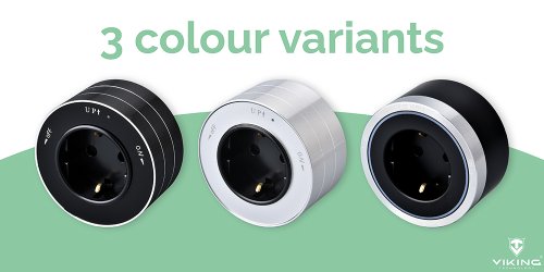 Zásuvkový modul Viking A40 je vybaven AC výstupem 230 V (16 A, 50 Hz) a je k dispozici ve třech barevných variantách.
