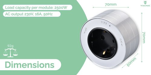Technické specifikace: Model: Zásuvkový modul Viking A40 Přípojkový konektor vstup: 230V, 16A ,50Hz Zátěžový výkon na jeden modul: 2500W AC výstup: 230V, 16A, 50Hz Rozměry: 7 cm x 7 cm x 5 cm Hmotnost: 92g